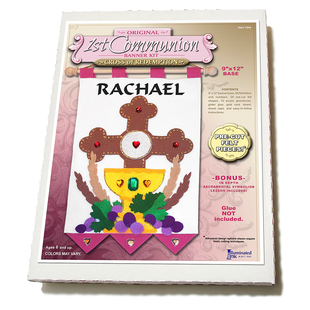 Your child can customize it with their own name, making it a meaningful keepsake for their special day. The kit includes pre-cut felt pieces, a gold cord, a hanging dowel, and all the materials needed to design a beautiful, faith-filled banner to commemorate their First Holy Communion.