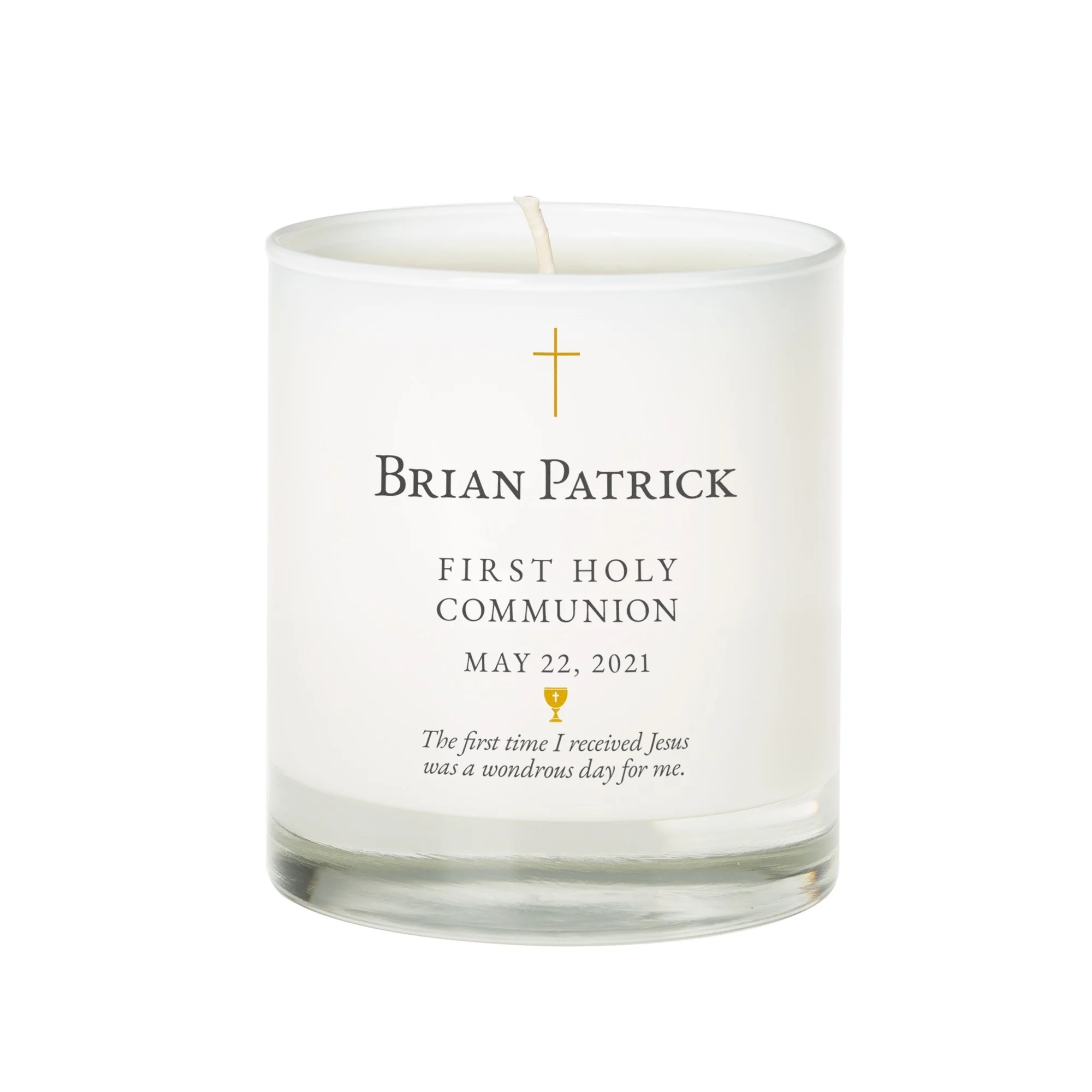Crafted in a white glass vessel with a refined, minimalist design, the candle features free personalization to include the child’s name and First Communion date. These thoughtful details transform it into a one-of-a-kind keepsake that captures the joy and reverence of this important sacramental moment.