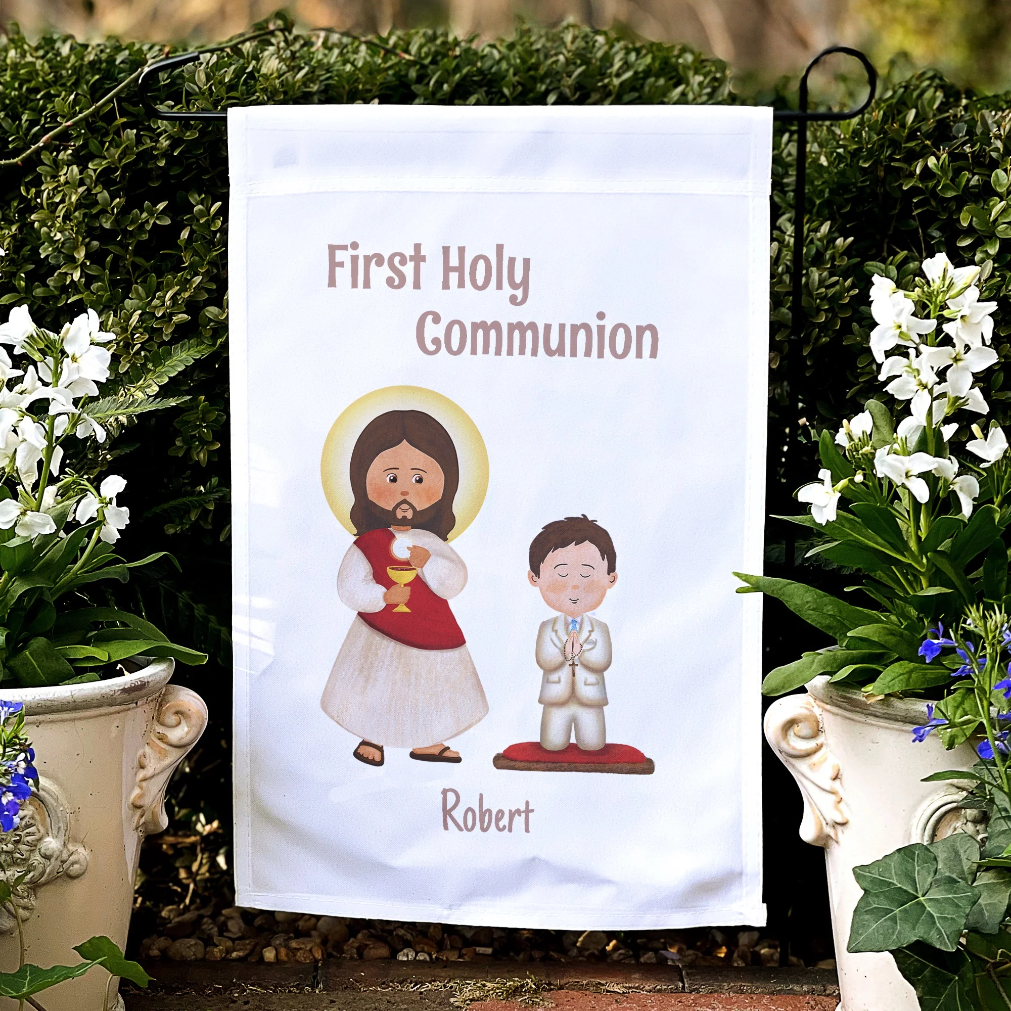Our All God's Children products are special gifts for little ones to remember the day they received Jesus in the Holy Eucharist for the first time. These delightful gifts feature a cheerful image of Jesus Christ alongside a First Communicant. This exclusive All God's Children Personalized First Communion Garden Flag for Boys is a lovable piece of decor for a young boy to display in the yard or keep in his bedroom to serve as a constant reminder of Jesus's Real Presence in the Eucharist.