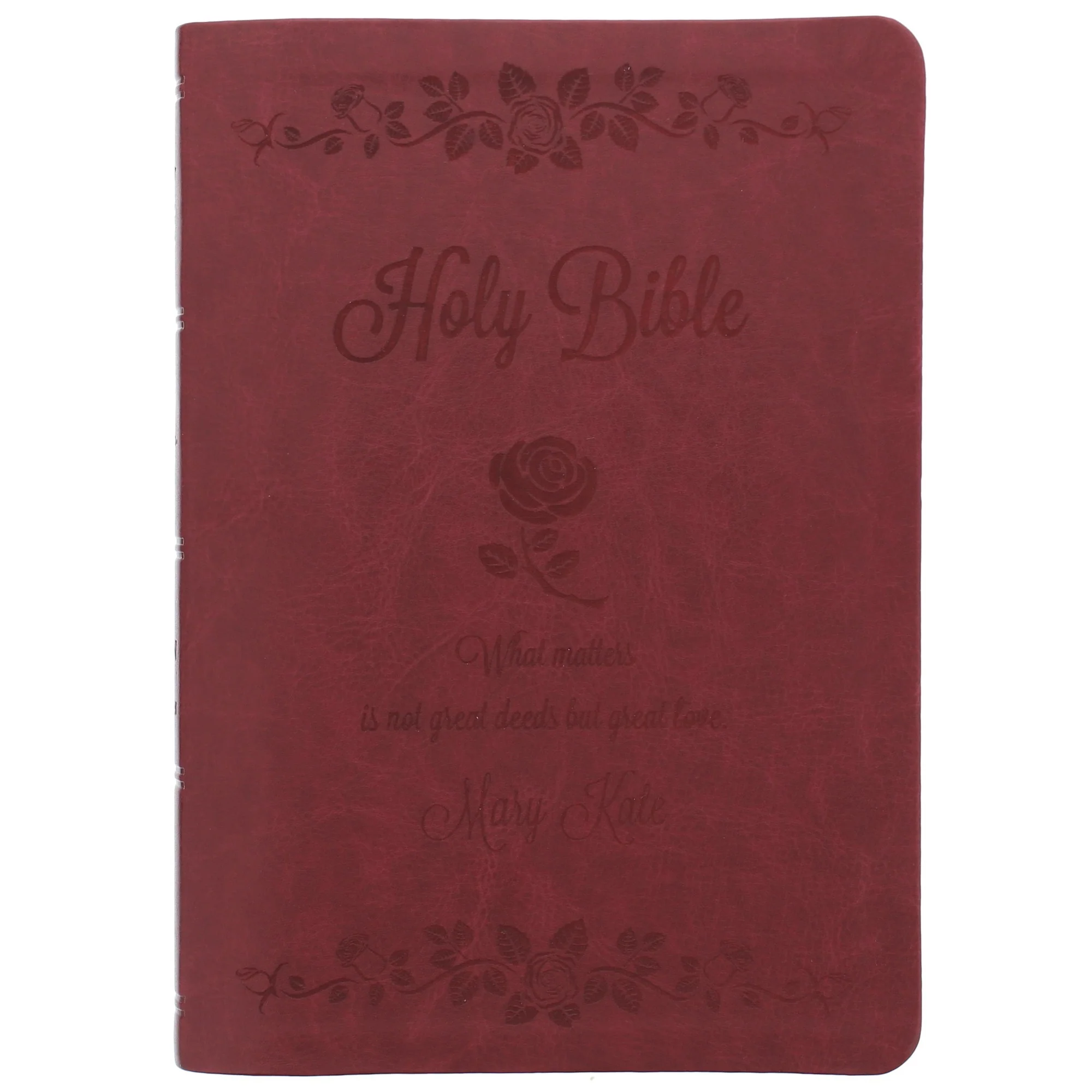 An exclusive design of the Catholic Company, this lovely Bible is beautifully laser engraved with the single rose, which has come to symbolize the much beloved Saint Therese of Lisieux. Her words, "What matters is not great deeds, but great love," add just a little more inspiration. Soft, leather-like cover with a satin ribbon tab.