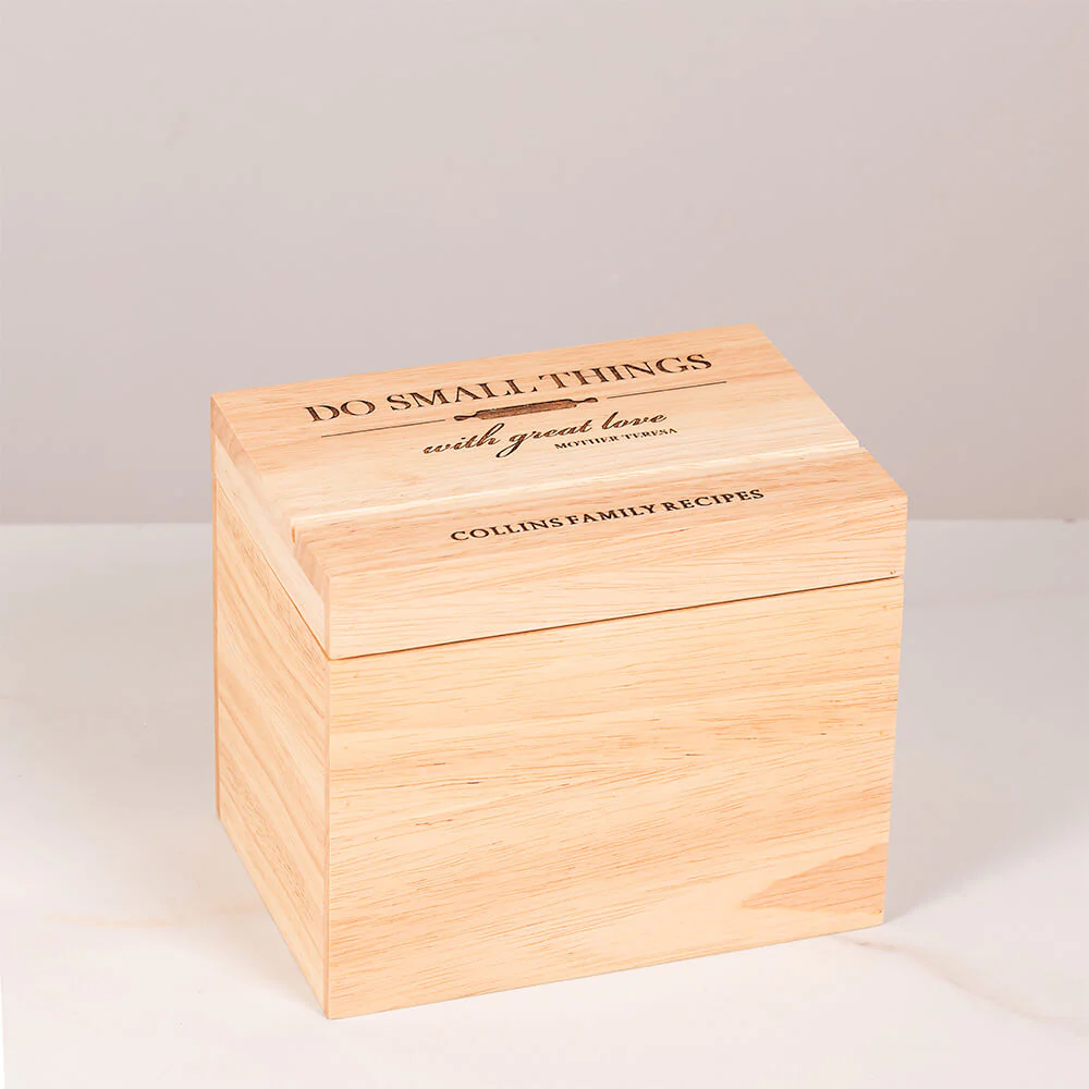 - Solid wood recipe box with engraved lid
