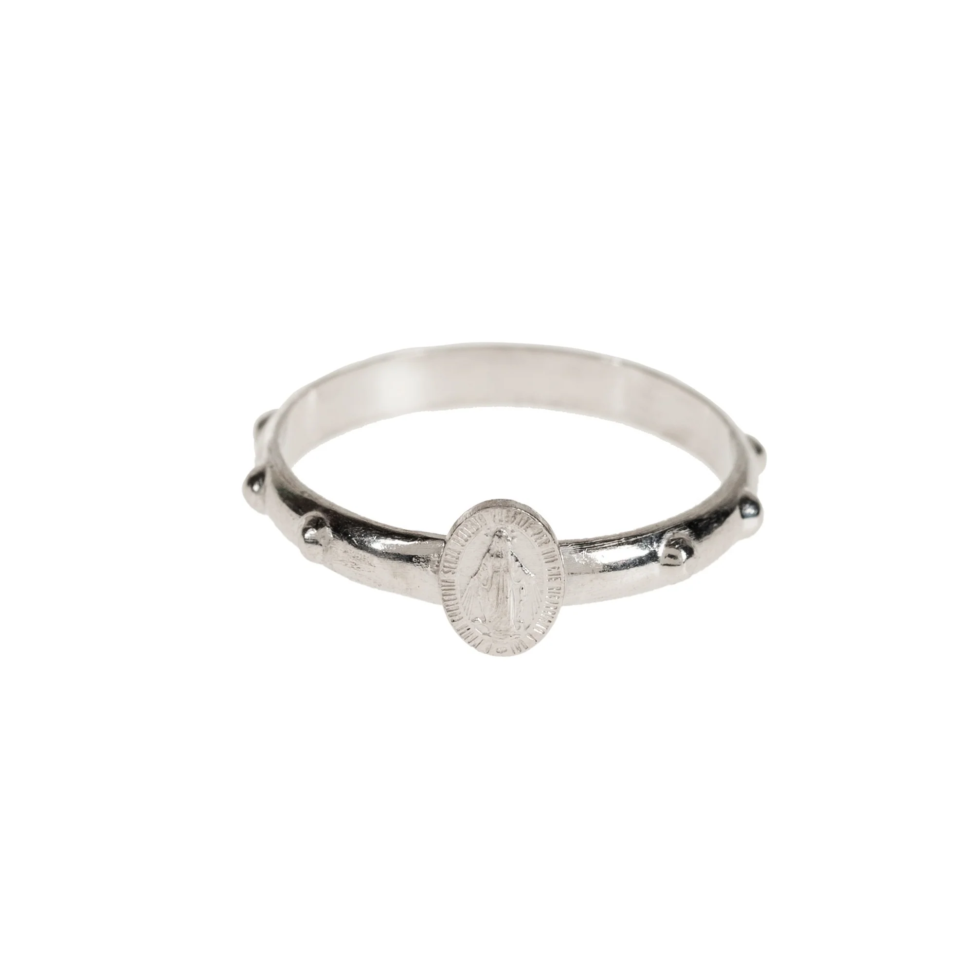 This sterling silver Miraculous Medal ring honors Our Lady and the gift of her Miraculous Medal and also helps you take your rosary with you easily, wherever you go. Small, embossed counters on the edge of the ring help you pray your Hail Marys throughout each decade. Faith, function, and beauty. Made in Italy.